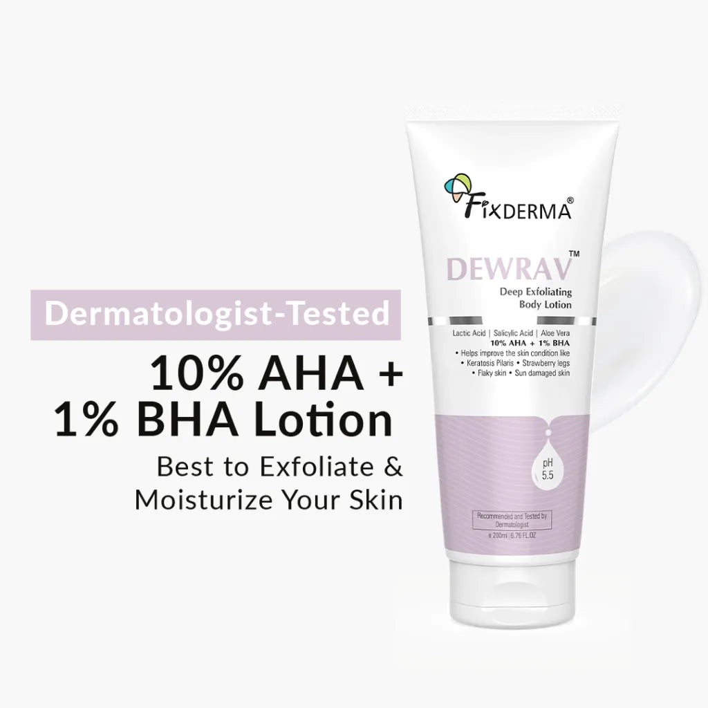 Unlike many harsh exfoliating lotions that can cause irritation and redness, Fixderma Dewrav Deep Exfoliating Body Lotion offers a gentle yet effective approach to exfoliation. Powered by Lactic Acid (AHA) and Salicylic Acid (BHA), it helps remove dead skin cells while remaining suitable for regular use. Enriched with Jojoba Oil and Aloe Vera, the formula locks in moisture to keep the skin soft and hydrated. Niacinamide further calms inflammation and strengthens the skin barrier. Gentle enough for daily use, this lotion deeply moisturizes even thickened skin, leaving it smooth, comfortable and healthy.