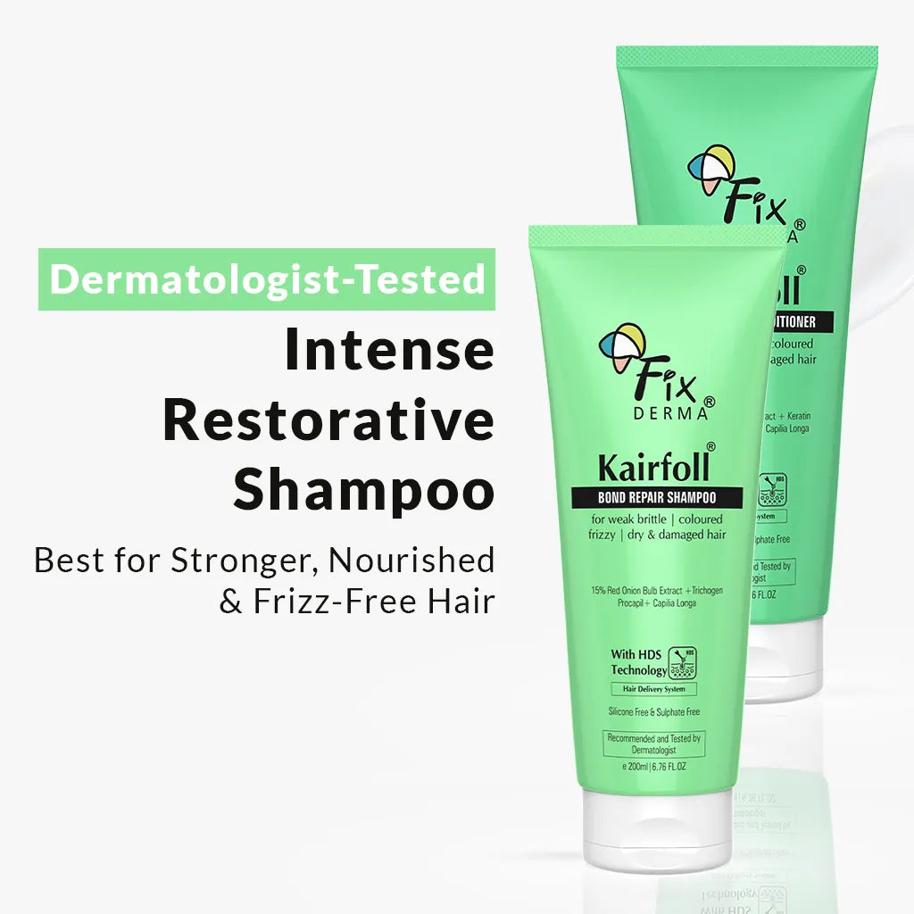 Kairfoll Bond Repair Shampoo & Conditioner isn't just a promise—it is formulated with extensive research in hair care. Our formulation combines a perfect blend of Trichogen and Red Onion Bulb Extract that are validated for their efficacy and can rejuvenate weakened hair fibers, rebuild damaged structures, and repair, and strengthen hair from within to enhance overall hair health. Through clinical trials and studies, we've observed measurable improvements for weak brittle hair, coloured hair, and damaged hair.