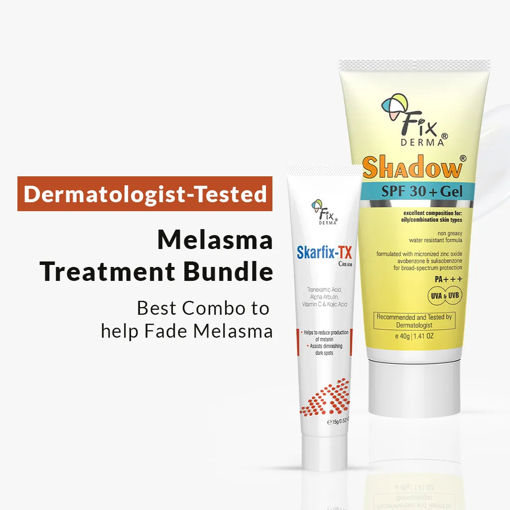 Fixderma Melasma Treatment Bundle is powered by clinically studied ingredients that work at the root of pigmentation. Skarfix-TX Cream combines Tranexamic Acid to inhibit melanin production, Kojic Acid to lighten dark spots, and Niacinamide to strengthen the skin barrier and reduce inflammation. Paired with Shadow SPF 30+ Gel Sunscreen, which is infused with advanced UV filters to shield skin from sun-induced pigmentation, this bundle provides a complete solution for melasma. This dermatologist-tested solution not only fades existing melasma but also prevents it from forming again, giving you clearer and more even-toned skin over time.