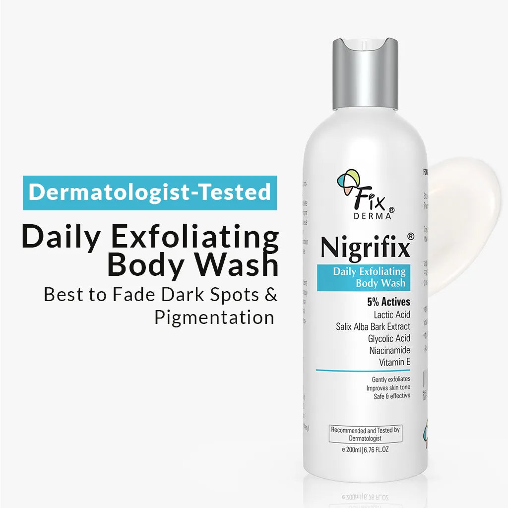 Daily chemical exfoliation for skin lightening can often be too harsh, leading to dullness instead of softness. Fixderma Nigrifix Daily Exfoliating Body Wash is formulated with a scientifically proven blend of 5% active ingredients that gently exfoliate dead skin cells while brightening and smoothing your skin without dryness.